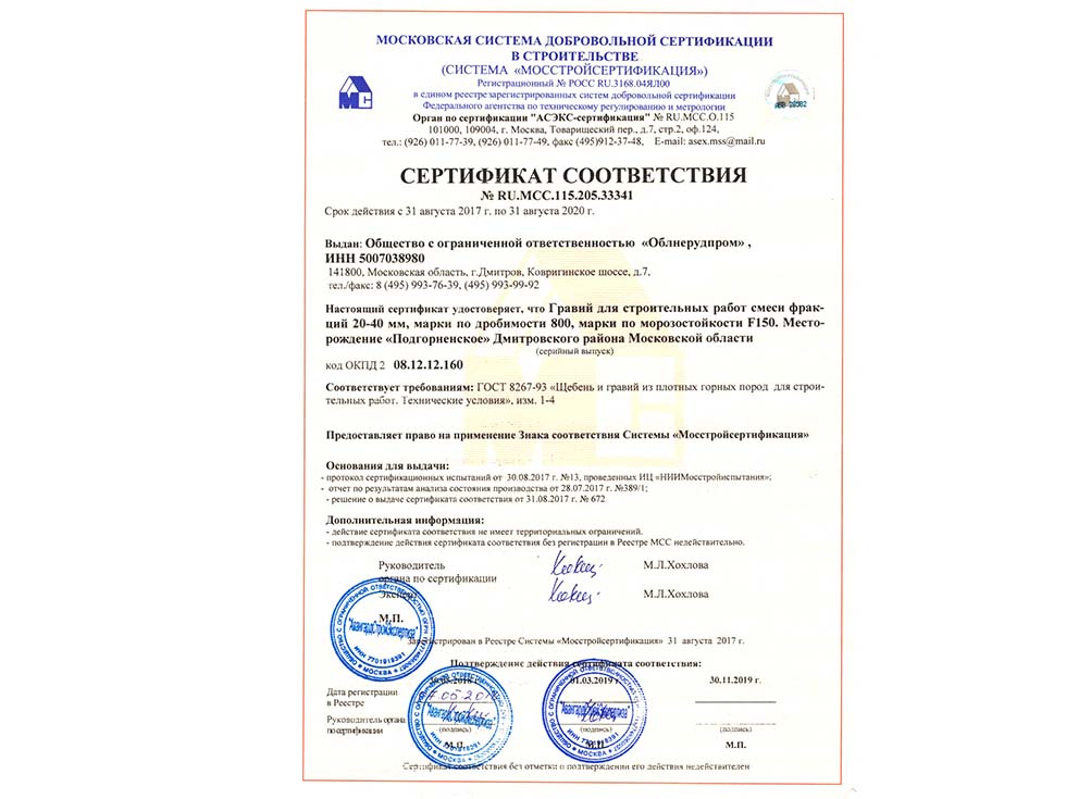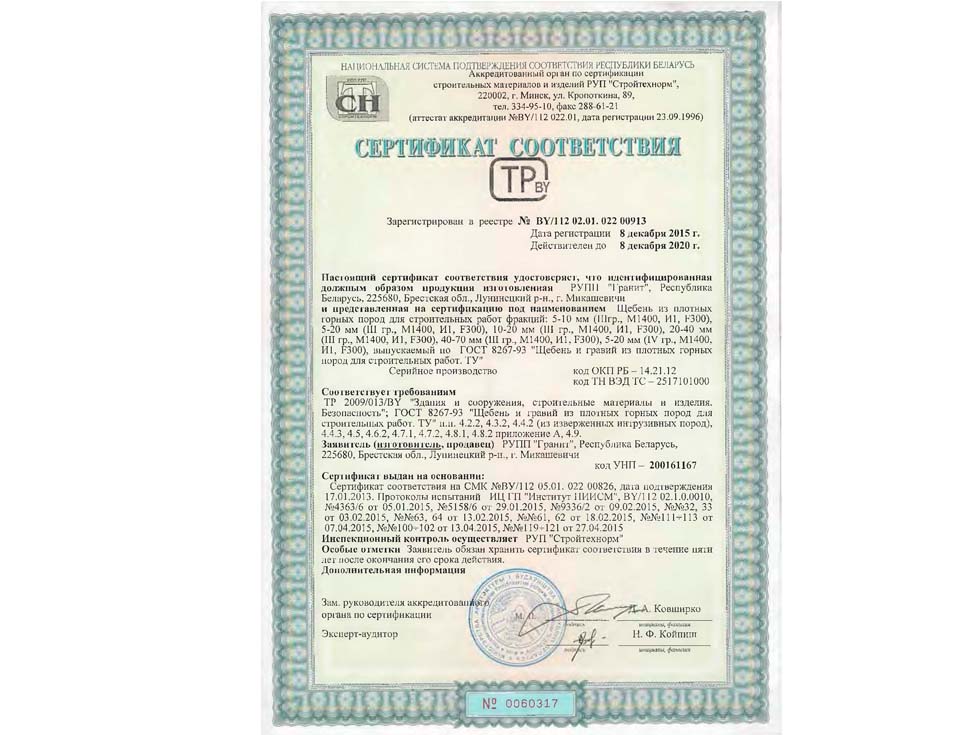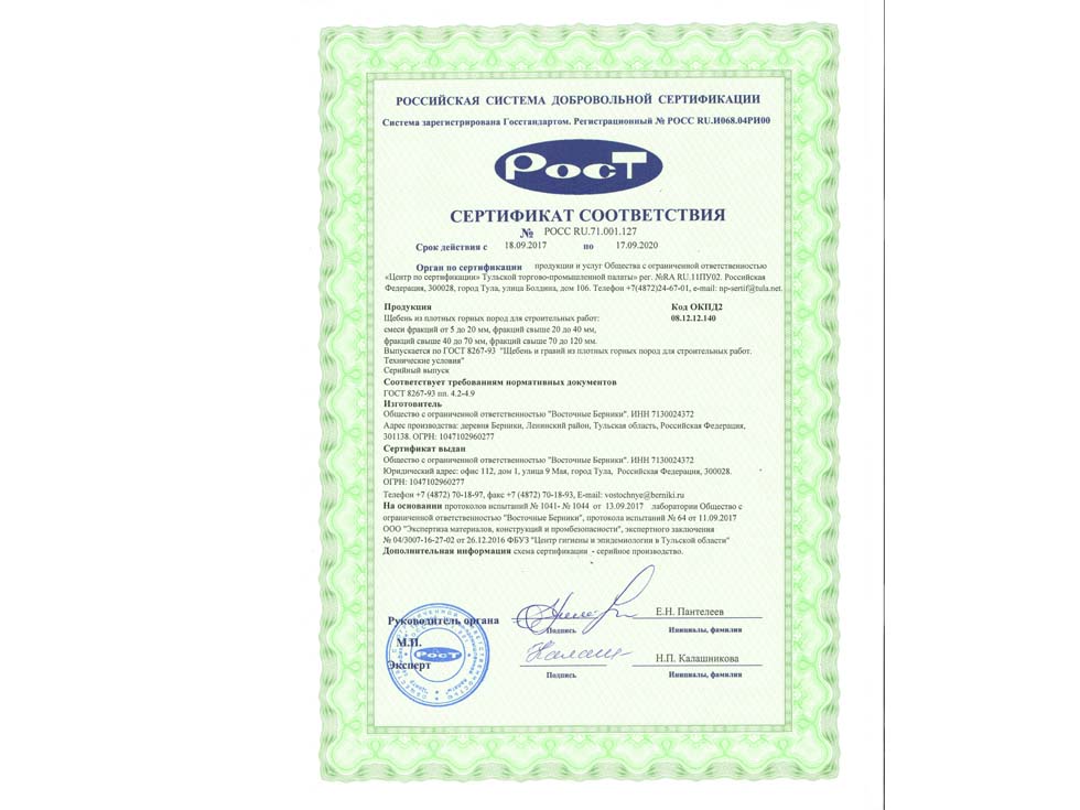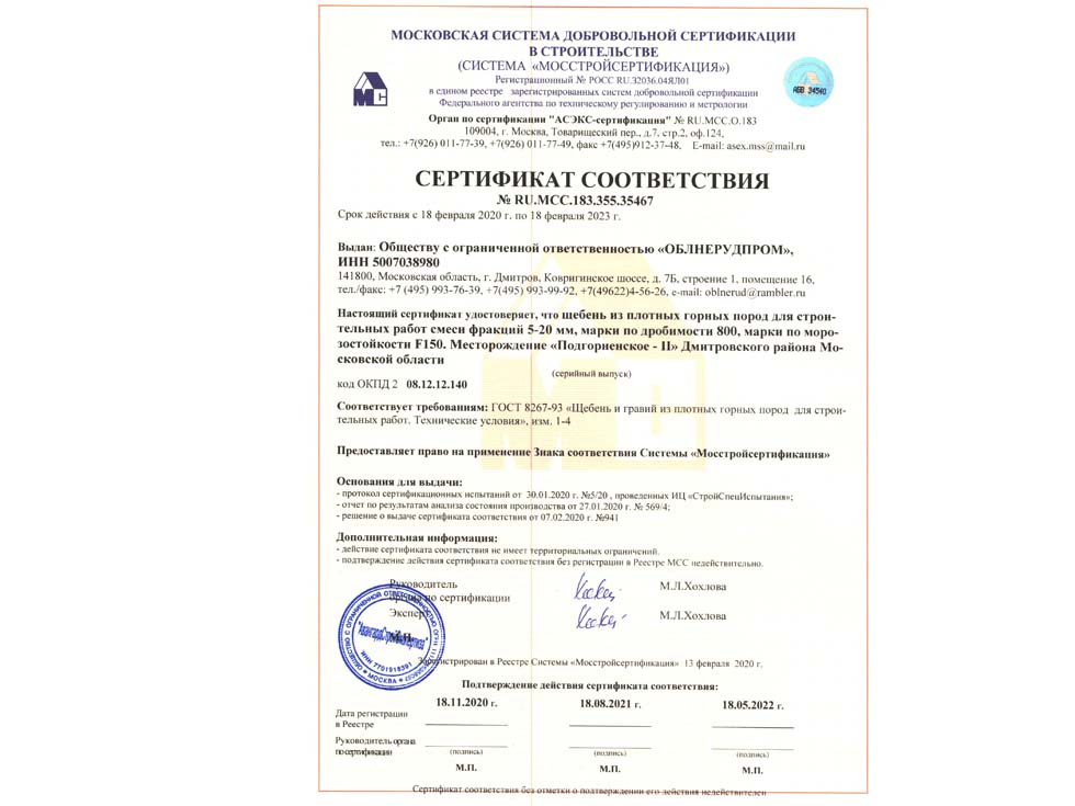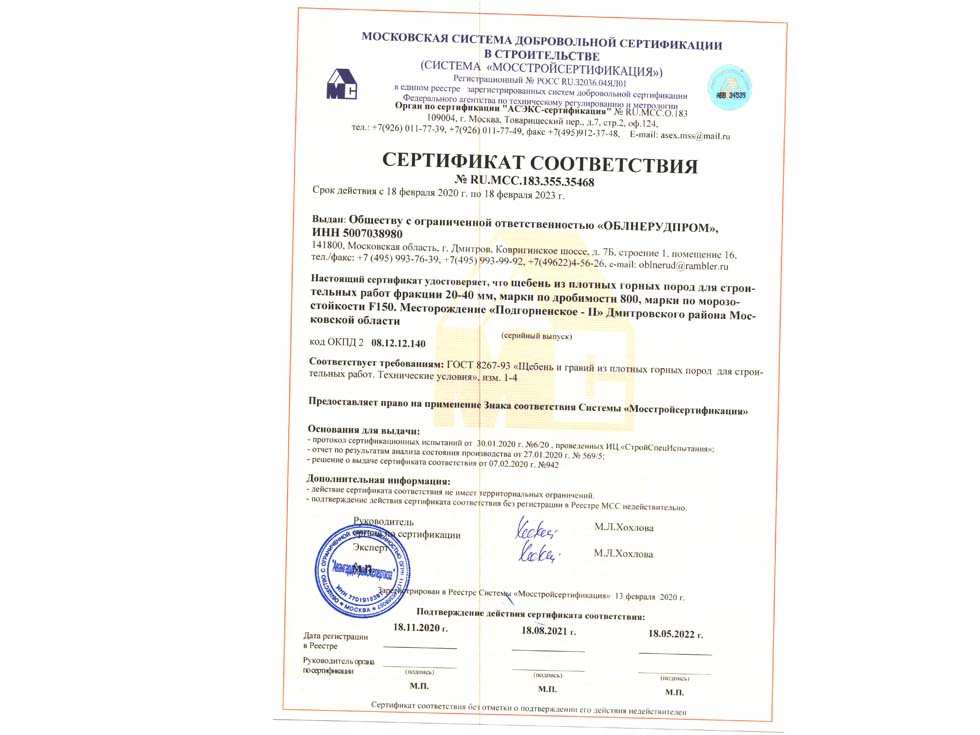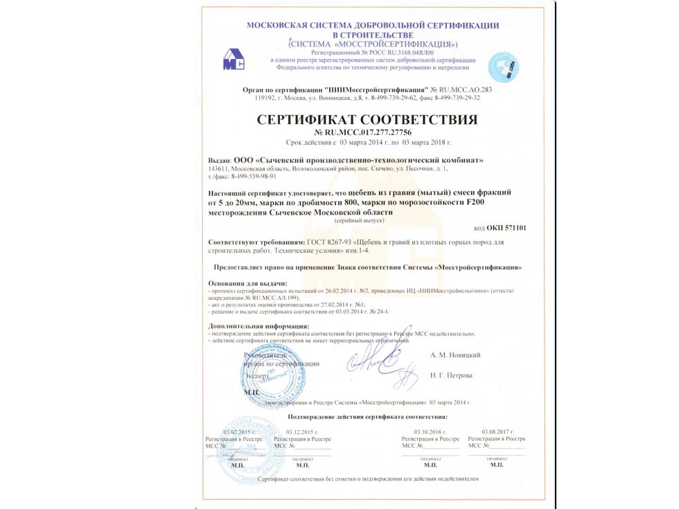 Наличие сертификата соответствия свидетельствует о том, что материал соответствует строительным нормам и ГОСТу. К примеру гранитный щебень должен по качеству и составу породы соответствовать ГОСТ 25607-209 «Смеси щебено-гравийно-песчаные для покрытий и основания автомобильных дорог и аэродромов». Сертификат должен быть обязательно должен быть зарегистрирован в реестре МСС, в противном случае он является недействительным и в случае проверки качества материалов или приемки работ на объекте в приемке работ будет отказано, что влечет за собой. Холдинг “ПРО” использует в поставках только сертифицированные материалы подтвержденные сертификатом.