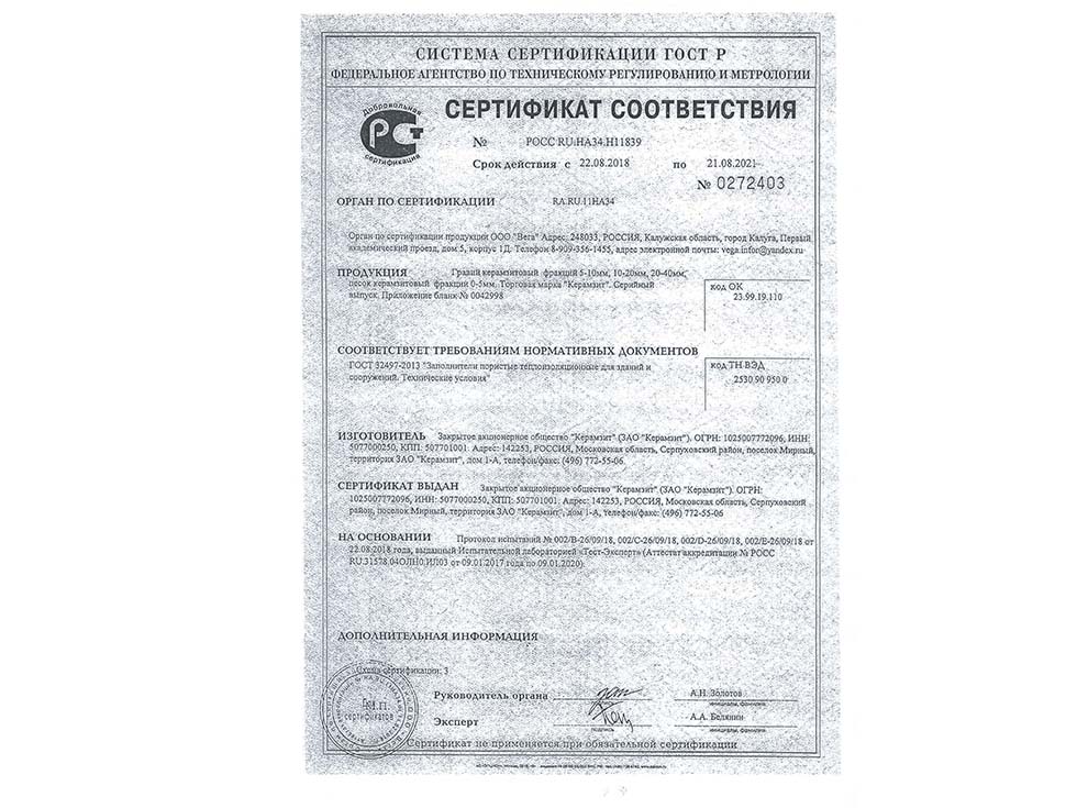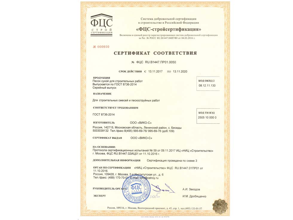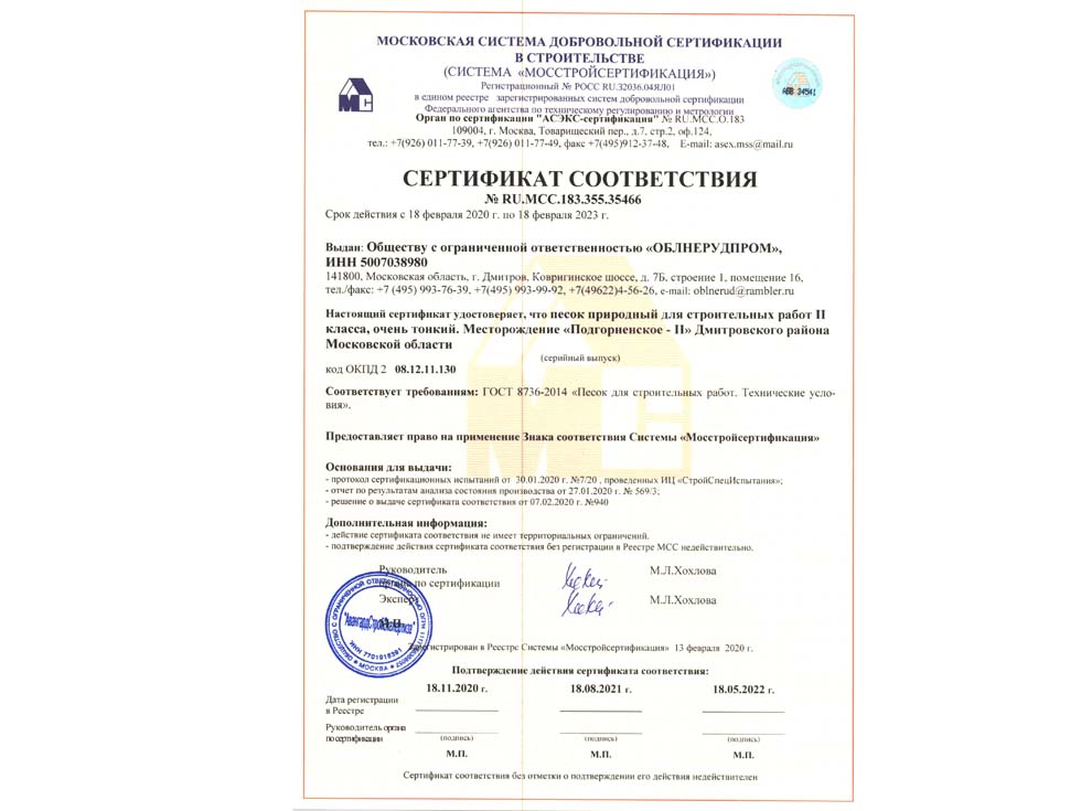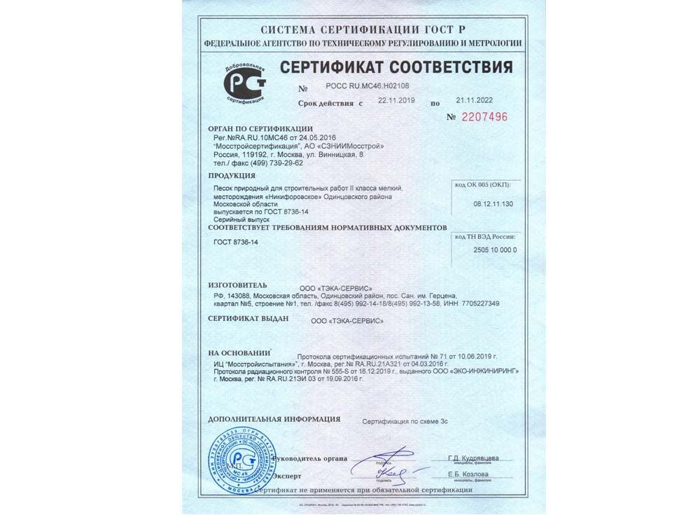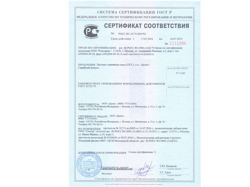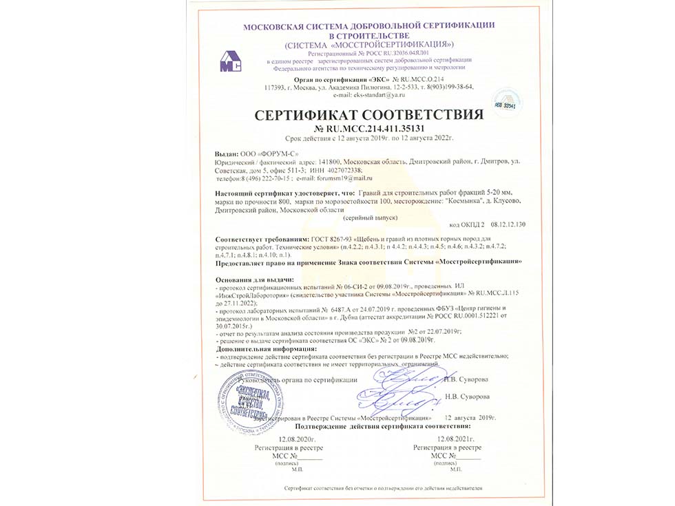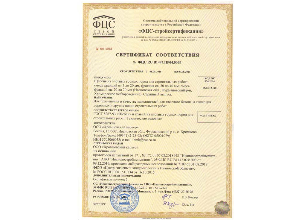 Наличие сертификата соответствия свидетельствует о том, что материал соответствует строительным нормам и ГОСТу. К примеру гранитный щебень должен по качеству и составу породы соответствовать ГОСТ 25607-209 «Смеси щебено-гравийно-песчаные для покрытий и основания автомобильных дорог и аэродромов». Сертификат должен быть обязательно должен быть зарегистрирован в реестре МСС, в противном случае он является недействительным и в случае проверки качества материалов или приемки работ на объекте в приемке работ будет отказано, что влечет за собой. Холдинг “ПРО” использует в поставках только сертифицированные материалы подтвержденные сертификатом.